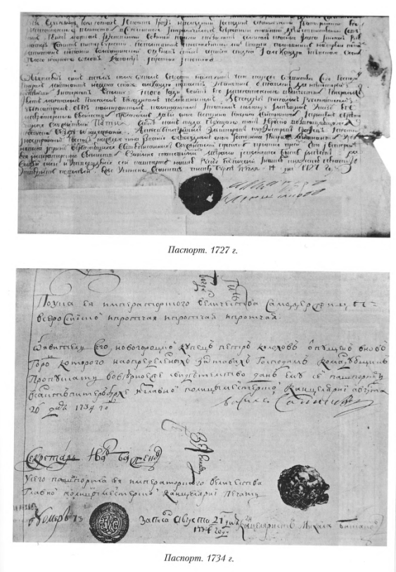 «Плакат» от 26.6(7.7).1724, вводивший подушную подать, требовал от податного населения при отъезде на заработки (т. е. отходничестве) или по др. делам «пропускного», или «покормёжного», письма (выдавалось земским комиссаром на срок от 1 месяца до 3 лет). Название «паспорт» закреплялось за официальными разрешительными документами на передвижение постепенно. К середине 18 в. в основном сложилась паспортная система (П.с.). Она дополнялась регулярным проведением ревизий. В последней трети 18 в. в результате губернской реформы 1775 и других реформ паспорт стал обязателен и для представителей духовенства, дворян, высших чиновников в случае их поездок за пределы постоянного местожительства, в т. ч. за границу.